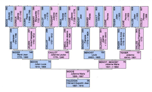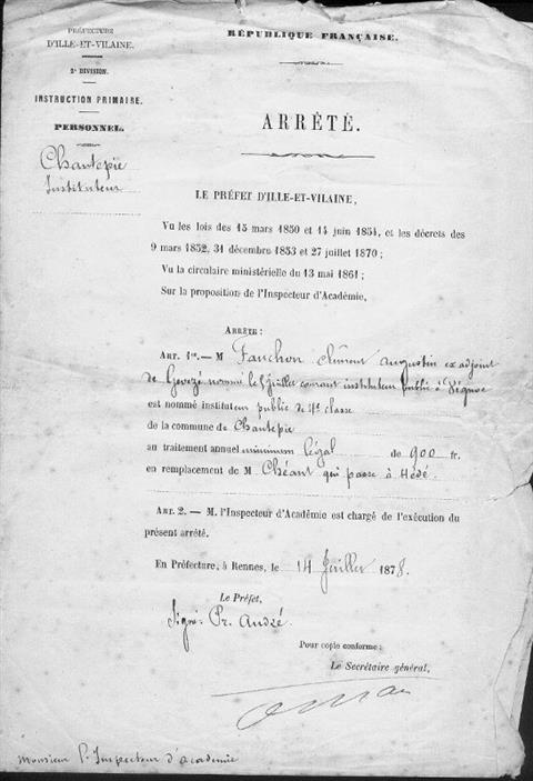 C'est en effet en juillet 1878 que mon arrière-grand-père Clément Augustin Jean FAUCHON, né et originaire de Chalandrey au Sud de la Manche, mais diplômé de l'Ecole Normale d'Institeurs de Rennes, est nommé instituteur public à Chantepie. Il s'y marie en 1883 à Julienne Marie BIDOIS, fille d'un fermier du village (ferme de Launay sur la route de Domloup).