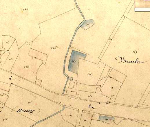 C'est certainement entre ces deux dates de 1878 et 1883 qu'il achète les parcelles 263 et 264 du cadastre dit Napoléonien mais qui date de 1843. Elles correspondent à la métairie dite du "petit Brault" par opposition à une autre métairie dite du "grand Brault", toutes deux dépendant jusqu'alors du "Manoir de Brault" dont la notre n'était séparée que par un ruisseau maintenant canalisé. Sur cet extrait cadastral on distingue l'emplacement d'un four à pain, sans doute banal c'est-à-dire partagé avec d'autres habitants et non taxé par le seigneur du lieu, et un petit bâtiment près de la route que nous n'avons pas connu. Mais on ne voit pas la remise que nous avons connue et que notre père a transformée en garage, ni une autre remise qui lui faisait pendant et que notre mère a connue.